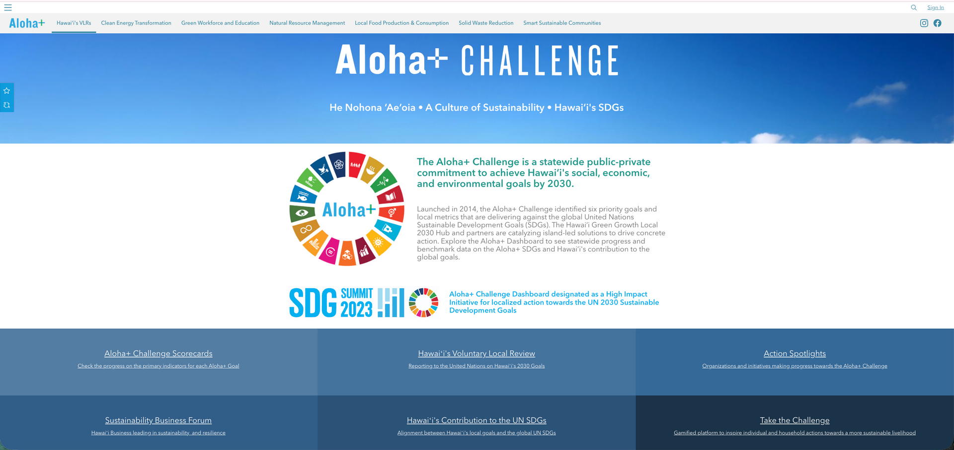 The Aloha+ Challenge is a statewide commitment to achieve Hawai‘i’s sustainability goals, and a locally driven framework to implement the Global Sustainable Development Goals (SDGs).
