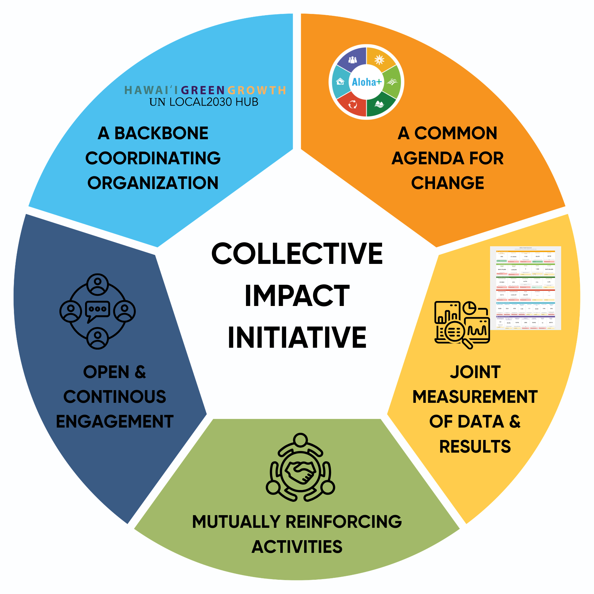 Collective impact is "the commitment of a group of important actors from different sectors to a common agenda for solving a specific social problem," as defined in 2011 by the Stanford Social Review. While not originally designed to fit this model, Hawai'i Green Growth exists today as the backbone organization stewarding the Aloha+ Goals and mobilizing the collective Network behind them for action and implementation. Our responsibility is to ensure that Aloha+ functions as a living, operating system for statewide collective action for a sustainable future, not just a framework.