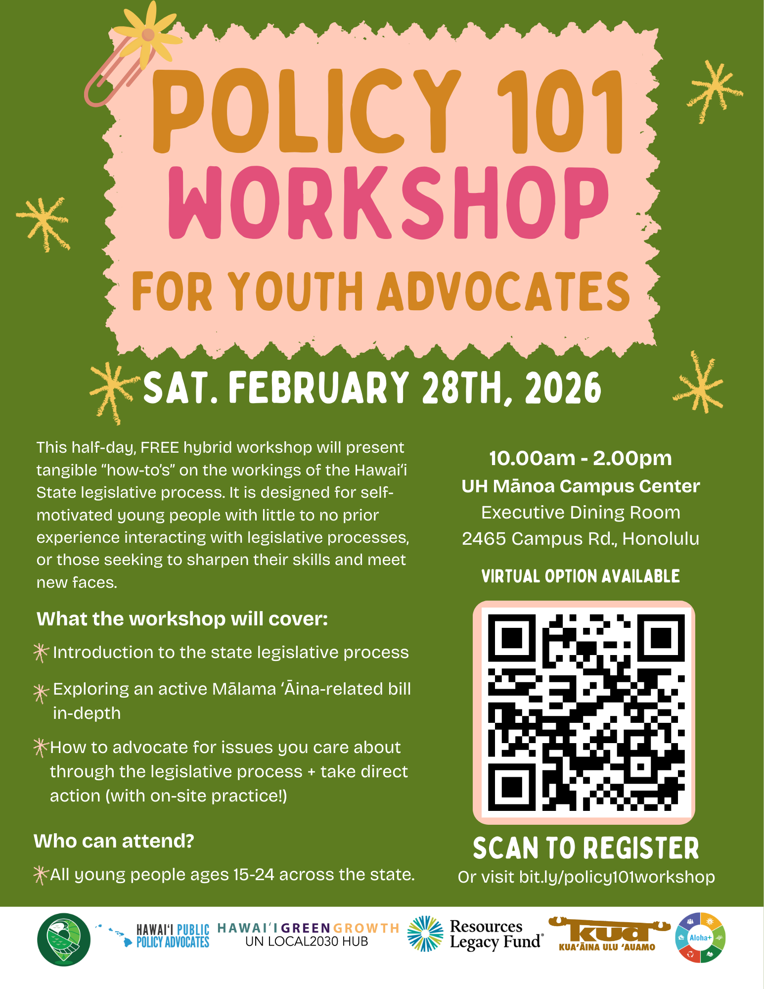 The workshop will be co-hosted by Hawaiʻi Green Growth, KUA, Hawaiʻi Public Policy Advocates, Care for ʻĀina Now, and Resources Legacy Fund, and is targeted at youth aged 15-20 (but all are welcome to attend).
